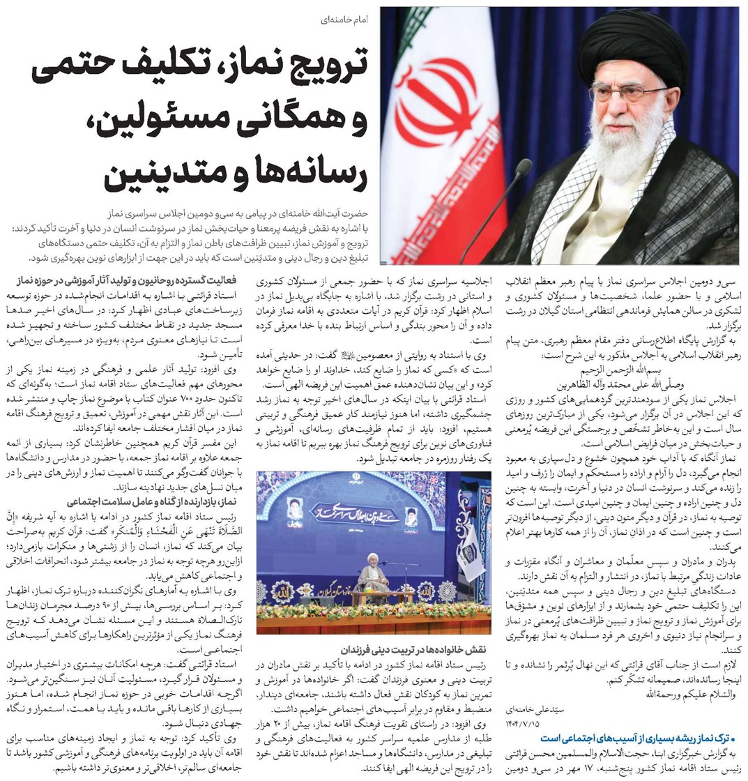 حضرت آیتالله خامنهای در پیامی به سیو دومین اجلاس سراسری نماز با اشاره به نقش فریضه پرمعنا و حیاتبخش نماز در سرنوشت انسان در دنیا و آخرت تأکید کردند: ترویج و آموزش نماز، تبیین ظرافتهای باطن نماز و التزام به آن، تکلیف حتمی دستگاههای تبلیغ دین و رجال دینی و متدیّنین است که باید در این جهت از ابزارهای نوین بهرهگیری شود.