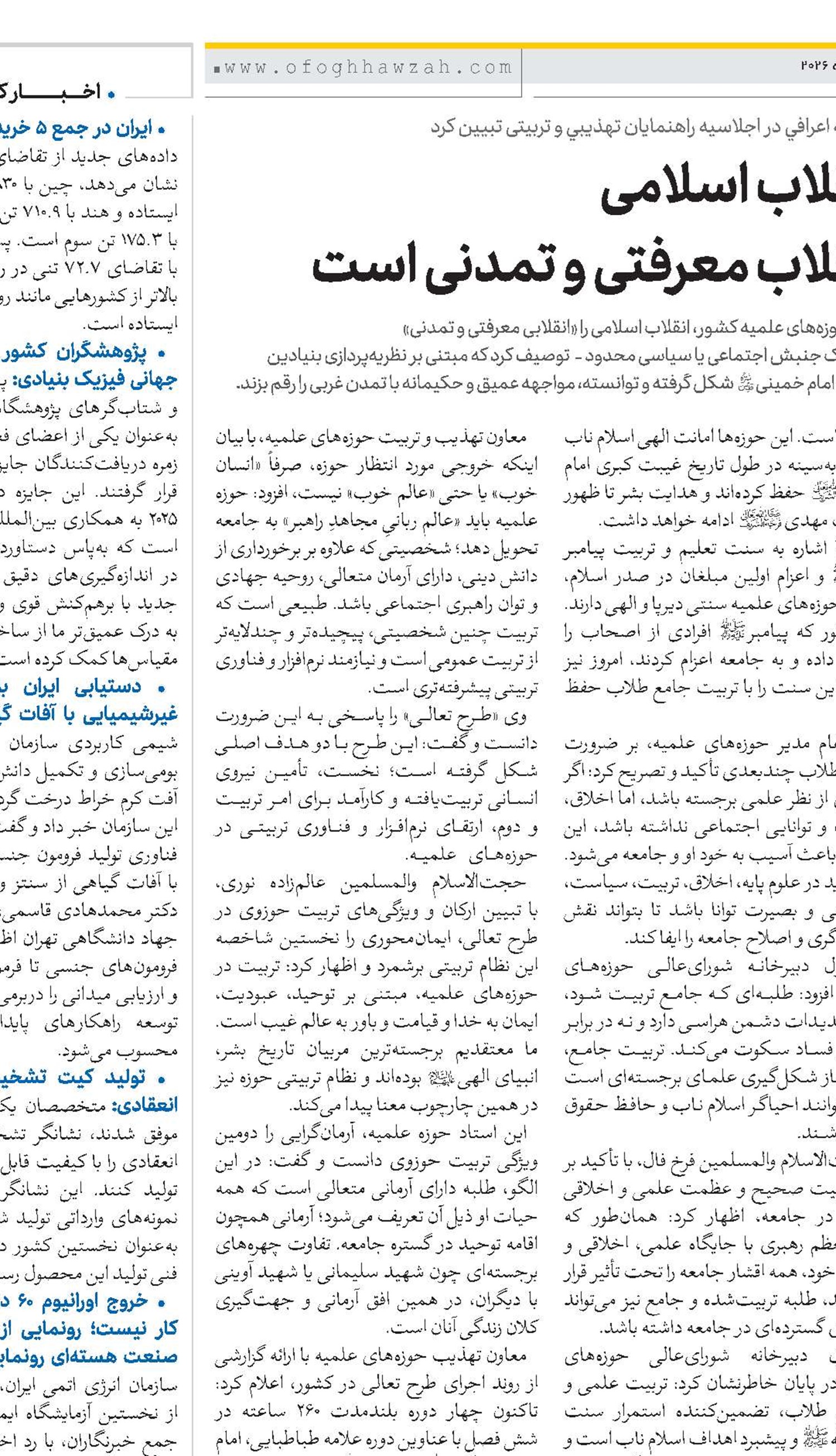 مدیر حوزههای علمیه کشور، انقلاب اسلامی را «انقلابی معرفتی و تمدنی» - و نه یک جنبش اجتماعی یا سیاسی محدود - توصیف کرد که مبتنی بر نظریهپردازی بنیادین حضرت امام خمینی(قد) شکل گرفته و توانسته، مواجهه عمیق و حکیمانه با تمدن غربی را رقم بزند.