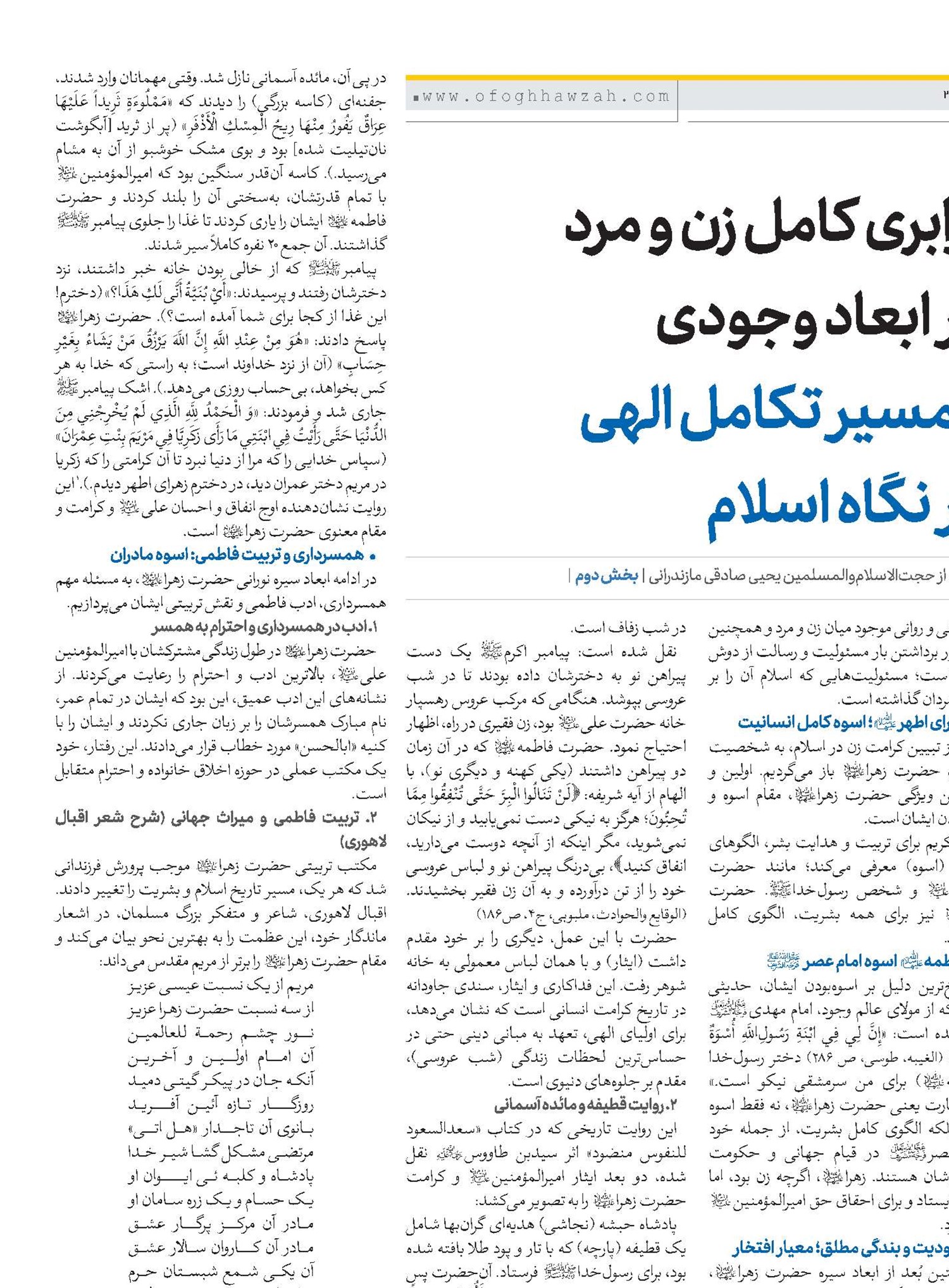 اسلام زن و مرد را در بعد الهی و انسانی کاملاً برابر میداند؛ ملاک برتری، تنها ایمان و عمل صالح است نه جنسیت. قرآن در آیاتی همچون آیه ۹۷ نحل و بهویژه آیه ۳۵ احزاب، این برابری معنوی را با صراحت اعلام میکند. زن مسلمان از استقلال کامل علمی و اقتصادی برخوردار است و تفاوتهای تکلیفی، ناشی از حکمت الهی و تفاوتهای طبیعی است نه نقص کرامت. حضرت زهرا(س) بهعنوان اسوه حسنه برای تمام بشریت، تجلی کامل عبودیت، ایثار، انفاق، کرامات الهی و تربیت فاطمی است که فرزندانش مسیر تاریخ را دگرگون ساختند. حجتالاسلام والمسلمین صادقی، استاد سطوح عالی قم، در مصاحبه اختصاصی با هفتهنامه «افق حوزه»، به بررسی «هویت و کرامت زن در اسلام» پرداخت که مشروح آن بدین شرح میباشد:
