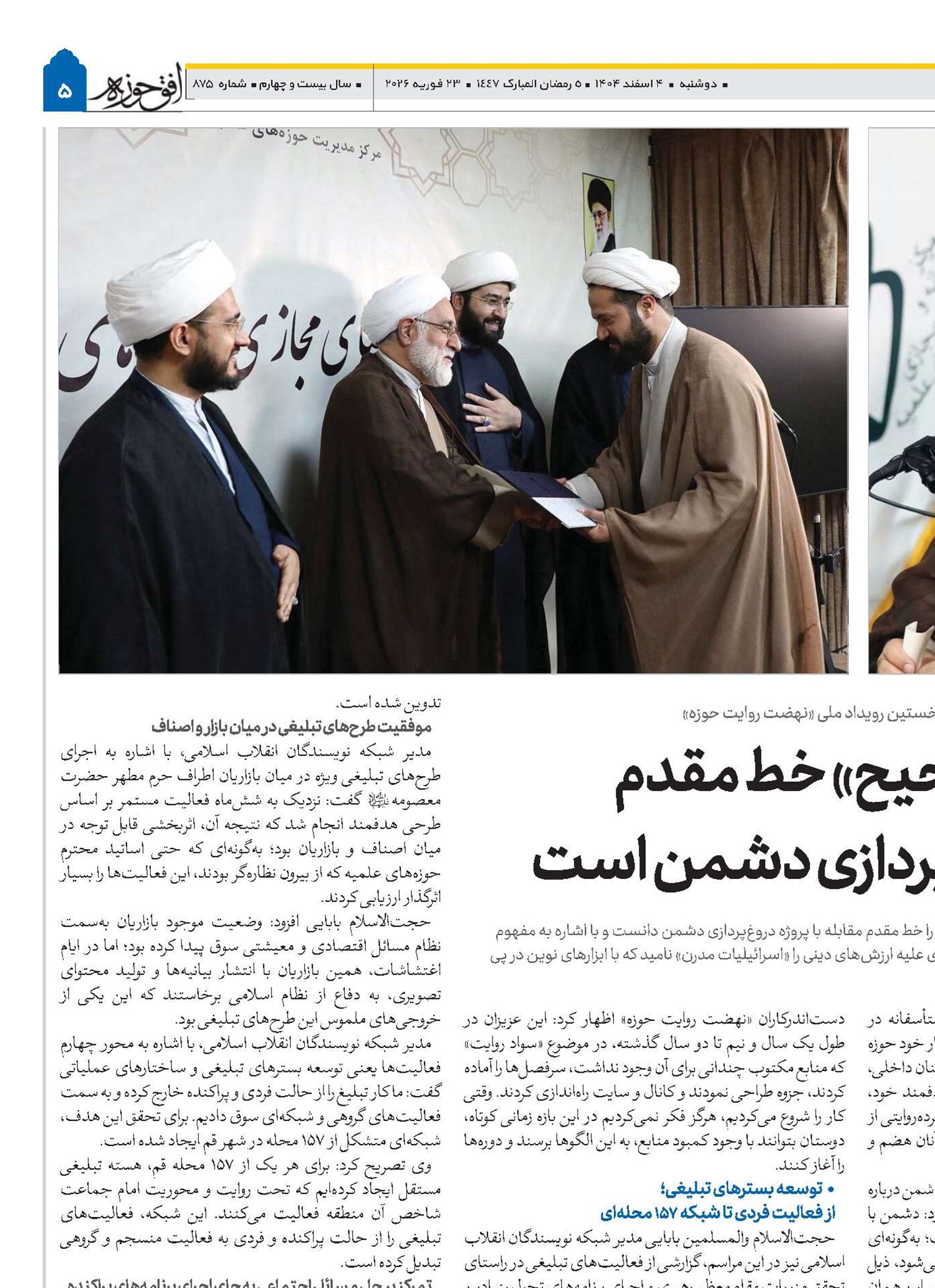 مدیر حوزههای علمیه کشور، در نشست صمیمی با اساتید، مبلغان و طلاب حوزه علمیه که در آستانه ماه مبارک رمضان در مدرسه فیضیه قم برگزار شد با اشاره به شرایط خطیر کنونی و تجربیات شخصی خود از دوران انقلاب بر لزوم شناخت دقیق میدان نبرد فرهنگی، اتخاذ راهبرد تهاجمی در کنار رویکردهای دفاعی و حضور میدانی مؤثر روحانیت در عرصه تبلیغ تأکید کرد.