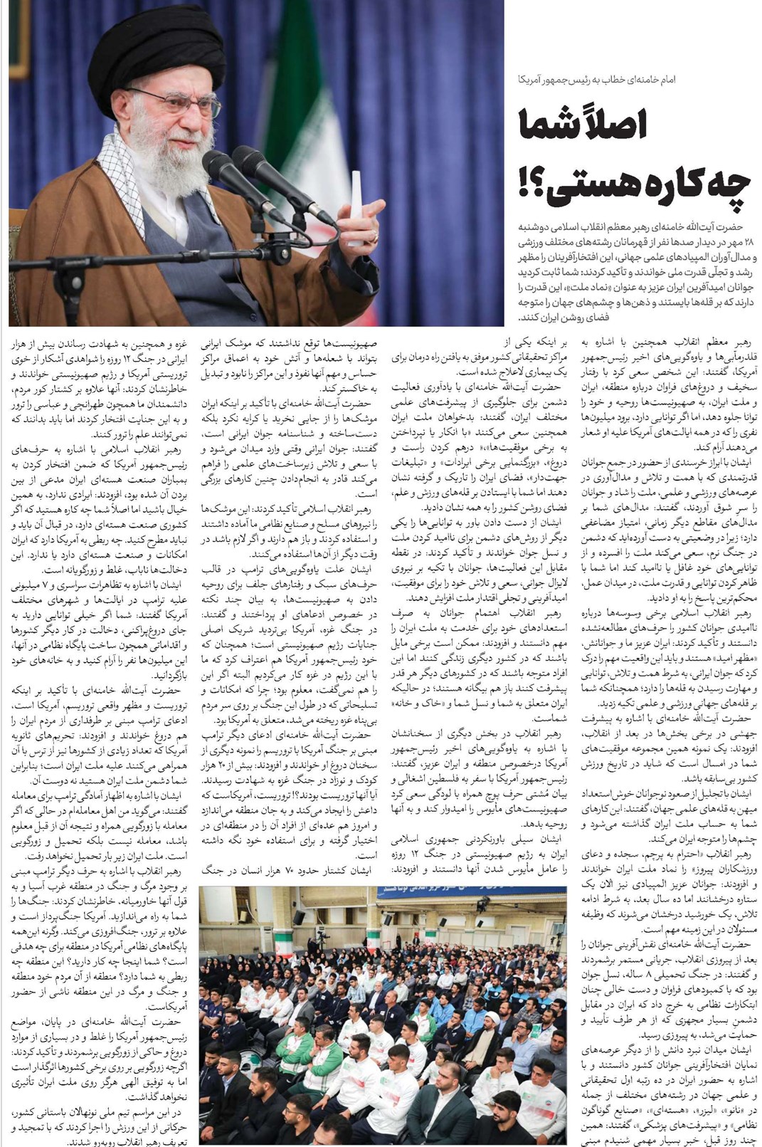 حضرت آیتالله خامنهای رهبر معظم انقلاب اسلامی دوشنبه 28 مهر در دیدار صدها نفر از قهرمانان رشتههای مختلف ورزشی و مدالآوران المپیادهای علمی جهانی، این افتخارآفرینان را مظهر رشد و تجلّی قدرت ملی خواندند و تأکید کردند: شما ثابت کردید جوانان امیدآفرین ایران عزیز به عنوان «نماد ملت»، این قدرت را دارند که بر قلهها بایستند و ذهنها و چشمهای جهان را متوجه فضای روشن ایران کنند.