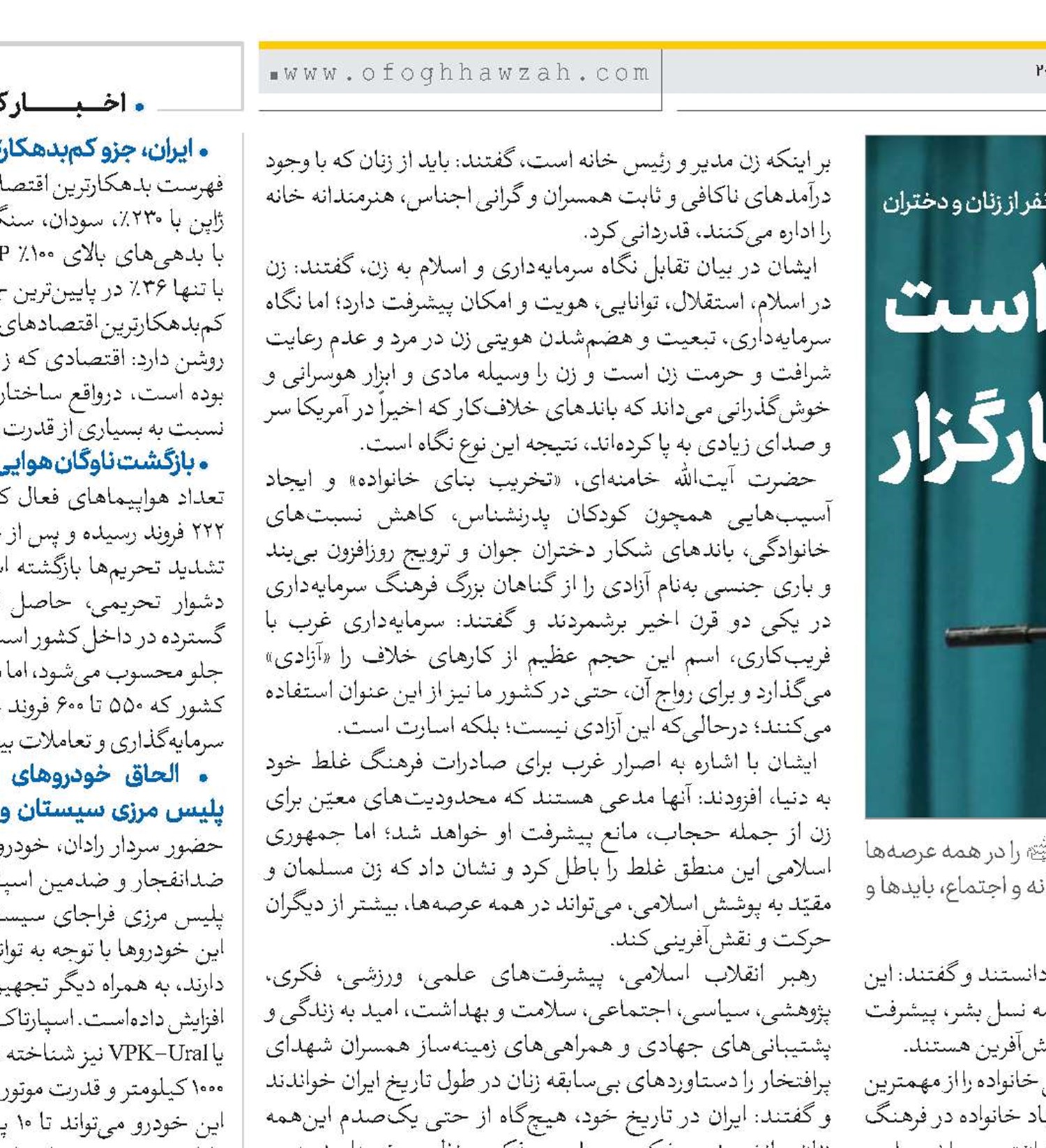رهبر معظم انقلاب اسلامی12 آذر در دیدار هزاران نفر از زنان و دختران مناطق مختلف کشور، حضرت فاطمه زهرا(س) را در همه عرصهها یک انسان عرشیِ آراسته به والاترین خصوصیات خواندند و با تبیین نگاه اسلام به شأن و حقوق زنان در عرصه خانه و اجتماع، بایدها و نبایدهای رفتار مردان با همسران و زنان را در زمینههای مختلف تشریح کردند.