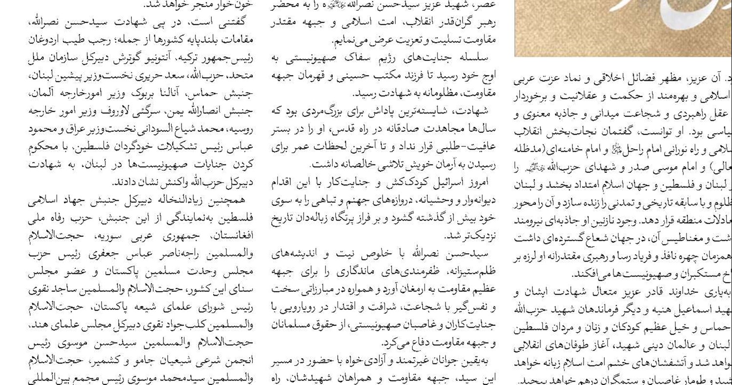 سید حسن نصرالله، روز جمعه ۶ مهر سال ۱۴۰۳ش/۲۷ سپتامبر ۲۰۲۴ در پی بمباران منطقه شیعهنشین ضاحیه در جنوب لبنان توسط رژیم صهیونیستی به شهادت رسید.