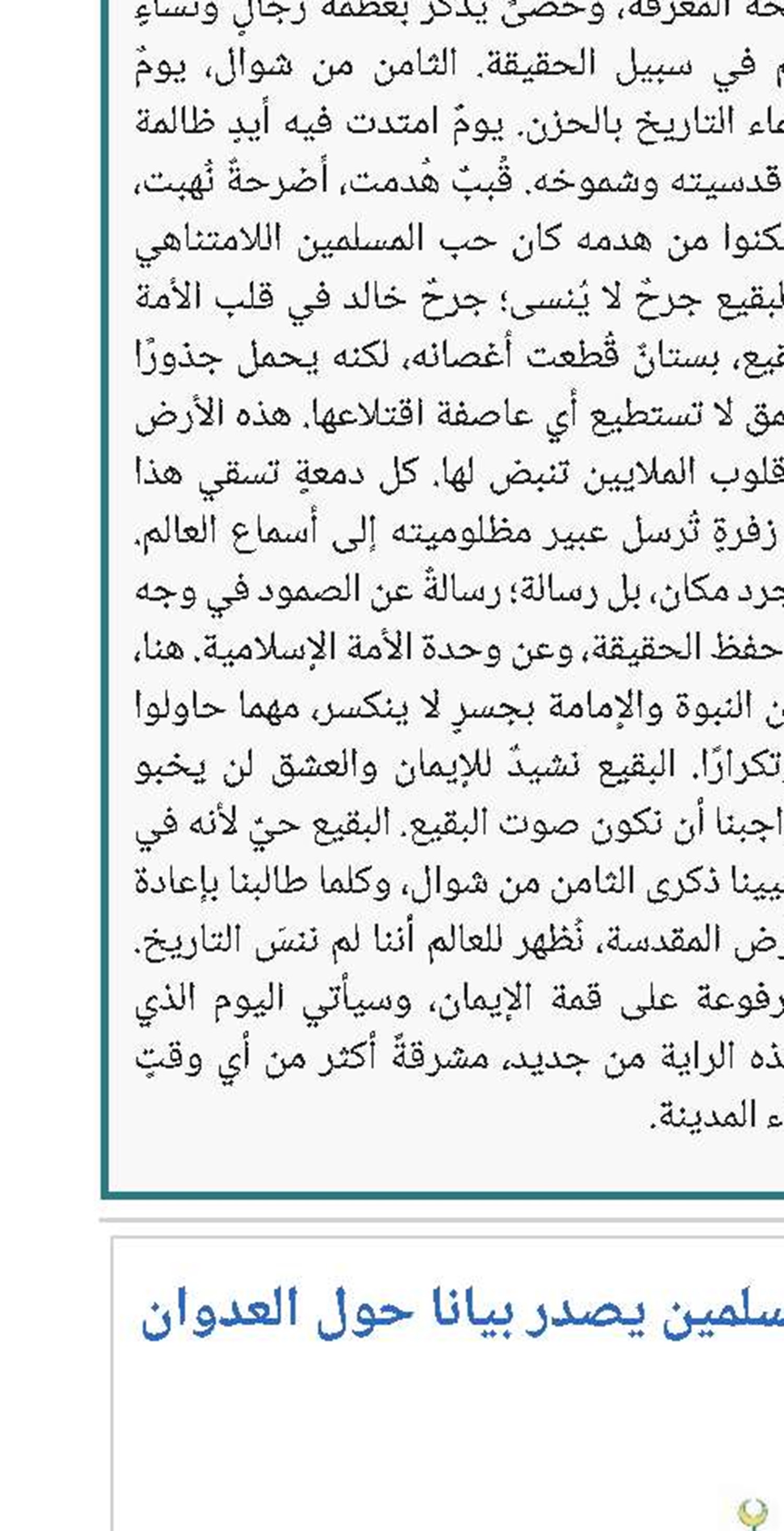 وأكد الاتحاد العالمي لعلماء المسلمين على وجوب قيام الدول العربية والإسلامية بإنشاء حلف عسكري موحد لحماية بلاد الإسلام والدفاع عن دينها ودمائها ومقدراتها وقرارها وأعراضها وهذا الوجوب من نوع العاجل الذي لا يجوز تأخيره لما يترتب على ذلك من المفاسد والفتنة في الأرض.