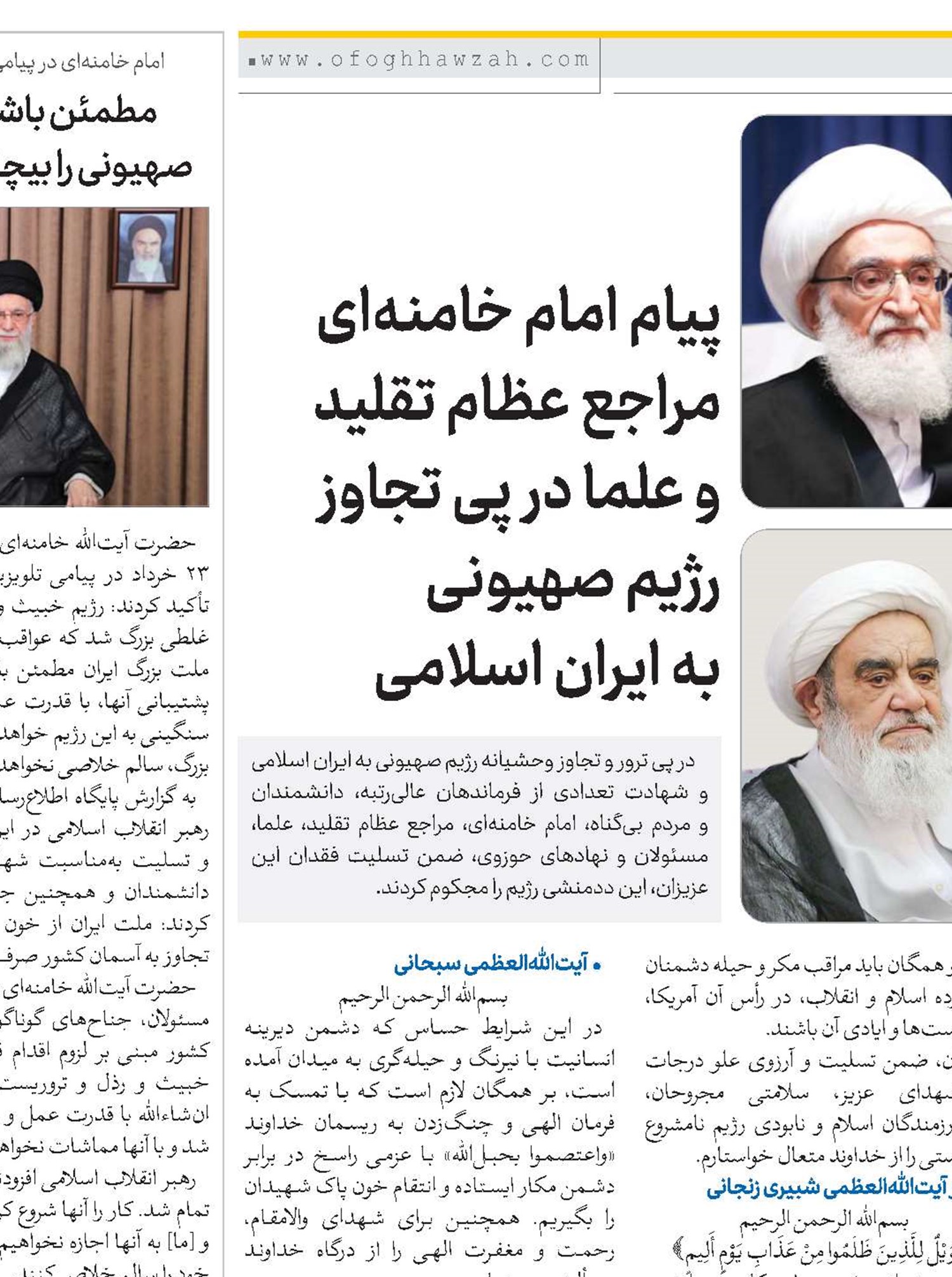 پیام امام خامنهای؛ مراجع عظام تقلید و علما در پی تجاوز رژیم صهیونی به ایران اسلامی