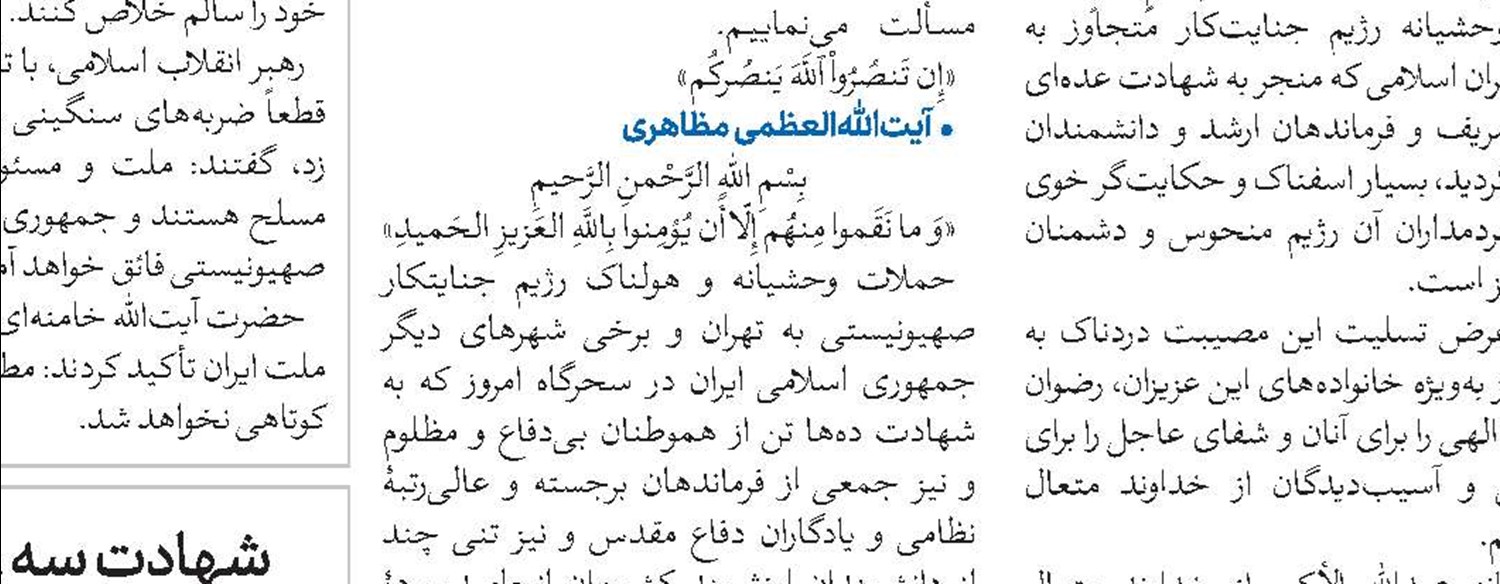 وی در پایان بیان کرد: در جنگ یک جریانی بهنام ستون پنجم وجود دارد. منافقین کسانی هستند که اخبار دروغین پخش میکنند. باید همه مردم در شرایط جنگی به این نکته توجه کنند و اخبار را از کانالهای معتبر مانند همین صدا و سیما بگیرند. به ملت عزیز با اتکای به قرآن میگویم: شما پیروز هستید. اسقاط هواپیمای اف 35 آمریکا شقالقمر بزرگی بود. همین عملیاتی که این شبها صورت میگیرد و سقوط هواپیما ضربه مهلکی به رژیم طفلکش صهیونیستی خواهد بود. ما دشمن را تا آخرین نفر تعقیب خواهیم کرد.