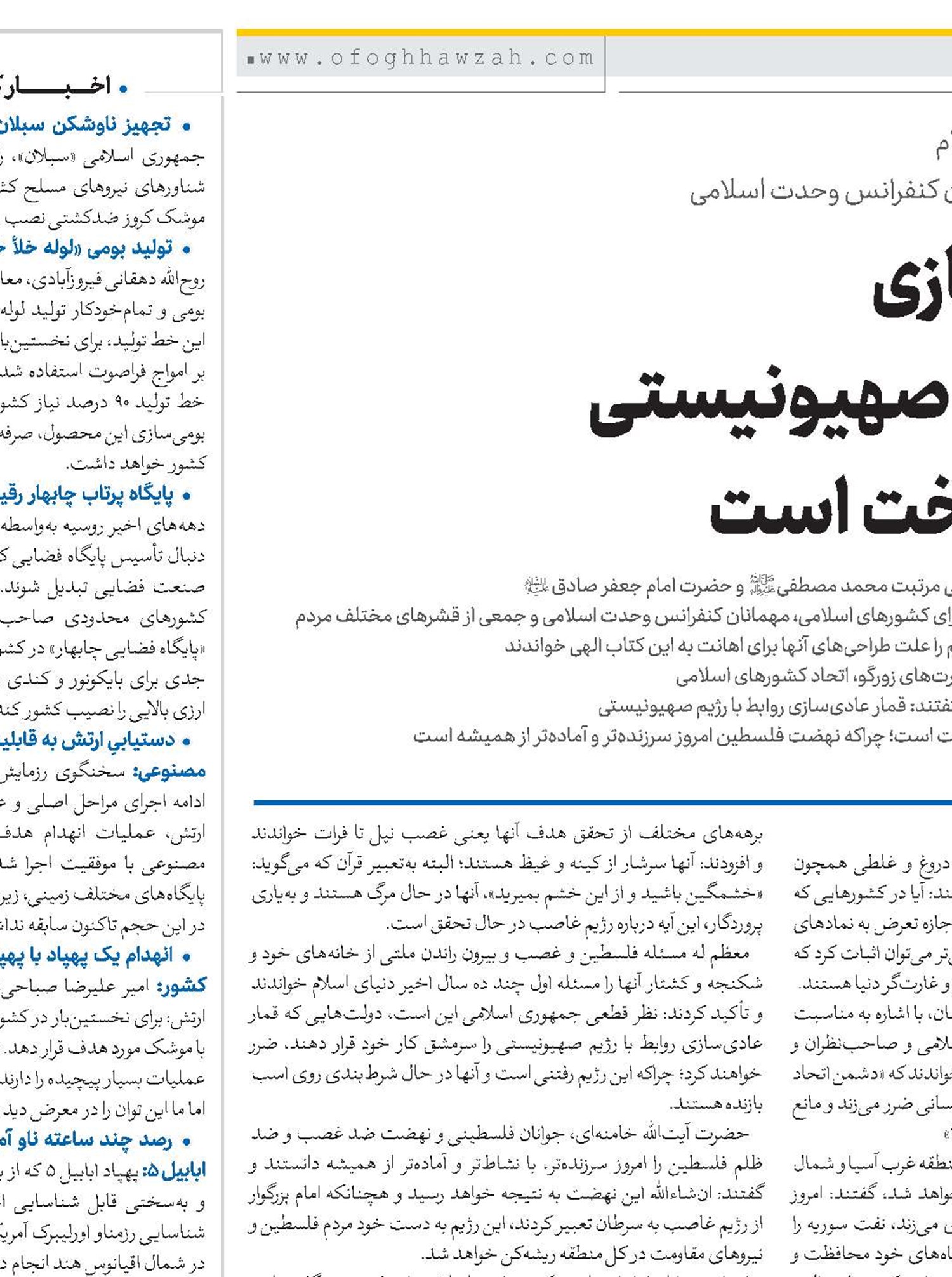 ایشان تعمق همه سران و شخصیتهای جهان اسلام بر روی مسئله حیاتی اتحاد را ضروری خواندند و در خصوص مسئله دیگر منطقه؛ یعنی جنایتهای مستمر رژیم صهیونیستی، گفتند: امروز این رژیم نه فقط از جمهوری اسلامی ایران بلکه از همه کشورهای اطراف خود، همچون مصر و سوریه و عراق نیز، لبریز از کینه و غیظ است.