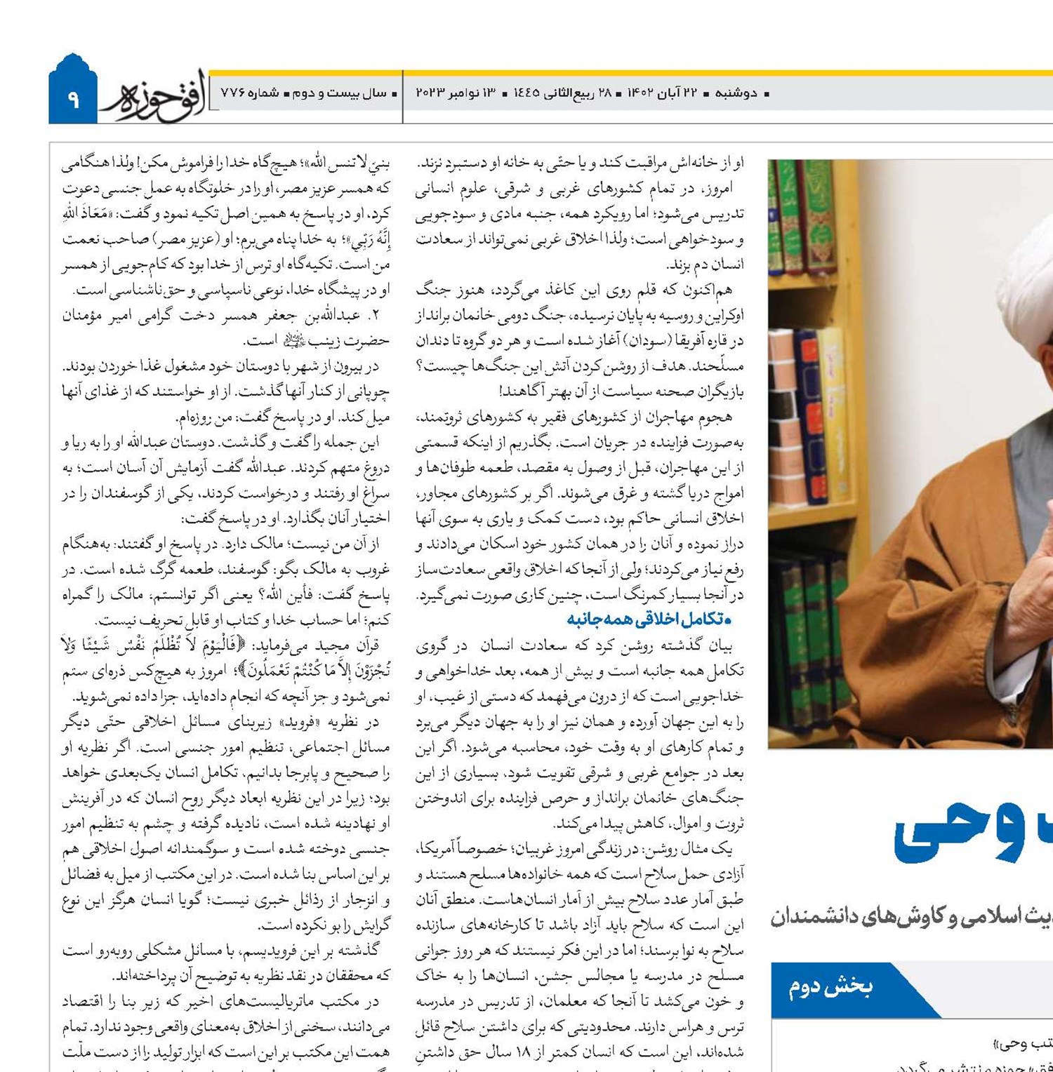 سلسله مباحث اخلاقی از مجموعه کامل جلسات «اخلاق در مکتب وحی» مرجع عالیقدر آیتاللهالعظمی سبحانی هر هفته در «هفتهنامه افق» حوزه منتشر میگردد. در شماره 775 مباحثی چون: انسان از منظر فیلسوفان و علماى اخلاق، اخلاق اسلامى امرى فطرى و از سنخ یادآورى است؛ نه نوآورى و تکامل در یک جهت و غفلت از جهات دیگر، مطرح گردید.