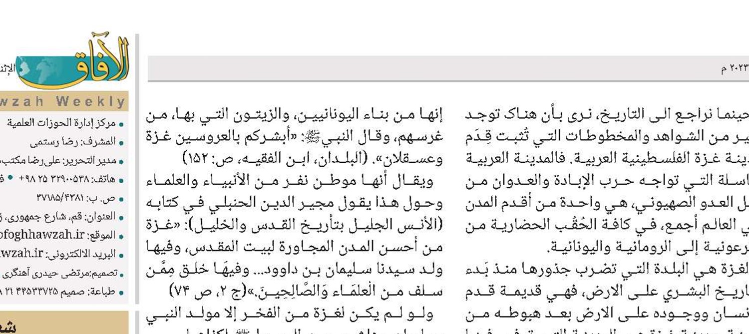 حینما نراجع الی التاریخ، نری بأن هناک توجد کثیر من الشواهد والمخطوطات التي تُثبت قِدَم مدينة غزة الفلسطينية العربية. فالمدينة العربية الباسلة التي تواجه حرب الإبادة والعدوان من قبل العدو الصهیوني، هي واحدة من أقدم المدن في العالم أجمع، في كافة الحُقُب الحضارية من الفِرعونية إلی الرومانية واليونانية.