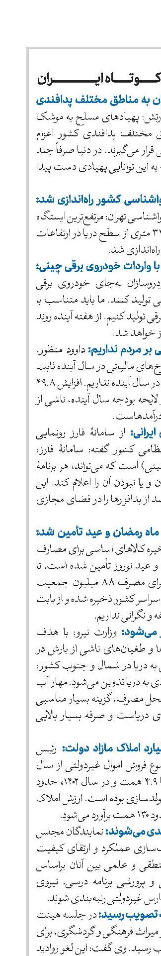 علیآبادی، وزیر صمت: خودروسازان بهجای خودروی برقی چینی، باید خودروی برقی ایرانی تولید کنند. ما باید متناسب با اقلیم کشور خودمان خودروی برقی تولید کنیم. از هفته آینده روند برقی شدن تاکسیرانی کشور آغاز خواهد شد.