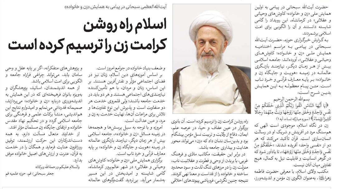 آیتاللهالعظمی سبحانی در پیامی به همایش «زن و خانواده»