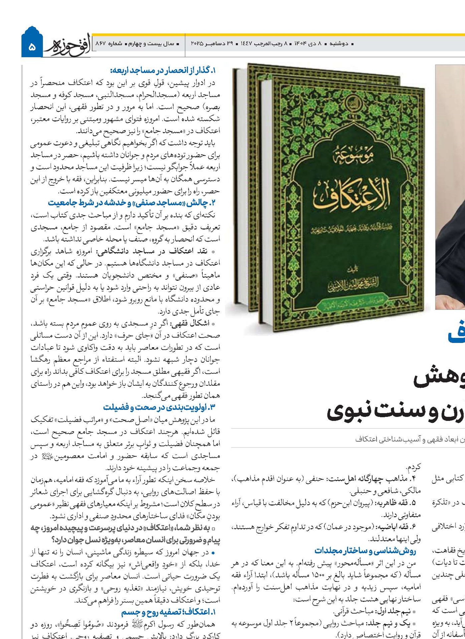 ادامه از صفحه 5 اعتکاف، این آیین دیرپای توحیدی و سنت حسنه نبوی، در دهههای اخیر از یک عمل عبادی محدود در شبستانهای غربت، به یک شعیره عظیم و میلیونی در سطح جامعه اسلامی بدل شده است. این گستردگی و اقبال روزافزون، بهویژه از سوی نسل جوان، ضرورت بازخوانی مبانی، مرزهای فقهی و آسیبشناسی میدانی آن را بیش از هر زمان دیگری نمایان میسازد. اثر گرانسنگ «موسوعة الاعتکاف» تلاشی است جامع و ده ساله که با نگاهی مقارن و استدلالی، این عبادت را در آینه مذاهب هشتگانه اسلامی واکاوی کرده است. مؤلف این اثر، محقق ارجمند جناب حجتالاسلام والمسلمین محمدامین پورامینی، با تتبع در آراء بیش از ۷۰ مفسر و بررسی بیش از400 منبع اصیل، کوشیده است تا نهتنها غبارِ زمان را از چهره این سنت نبوی بزداید، بلکه پاسخگوی نیازهای نوین فقهی در مواجهه با دنیای مدرن باشد. در این گفتوگوی تفصیلی، وی با عبور از مباحث انتزاعی، به چالشهای کاربردی نظیر «اعتکاف در مساجد صنفی و دانشگاهی»، «ضرورت مردمی ماندن و استقلال این شعیره از نهادهای دولتی» و همچنین «احیای سنت حضورِ بیتکلف عالمان در میان معتکفین» میپردازند. آنچه در ادامه میخوانید، دورنمایی است از یک دهه زیستِ علمی در فضای اعتکاف که میان «خلوتِ فردی معتکف» و «مصالحِ اجتماعی دین» پیوندی وثیق برقرار میکند.
