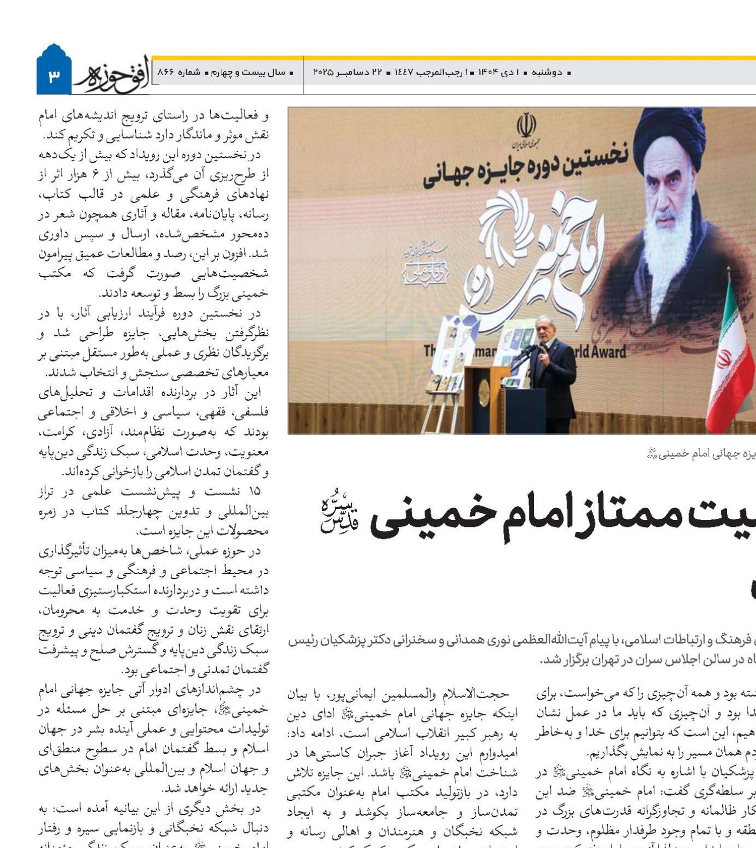 نخستین جایزه جهانی امام خمینی(قد) بههمت سازمان فرهنگ و ارتباطات اسلامی، با پیام آیتاللهالعظمی نوری همدانی و سخنرانی دکتر پزشکیان رئیس جمهور و دیگر شخصیتهای داخلی و خارجی، ۲۶ آذرماه در سالن اجلاس سران در تهران برگزار شد.