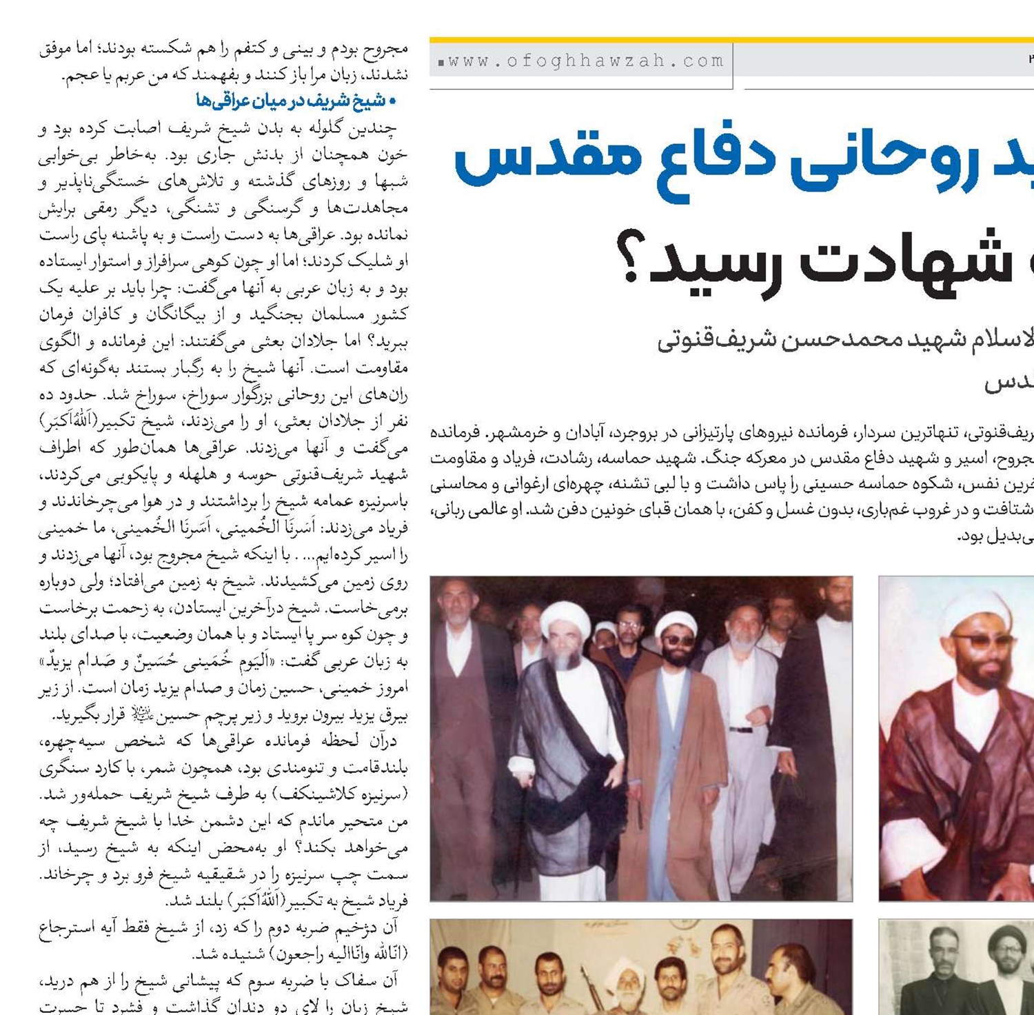 روحانی مجاهد، شهید محمدحسن شریفقنوتی، تنهاترین سردار، فرمانده نیروهای پارتیزانی در بروجرد، آبادان و خرمشهر. فرمانده جانبرکفان گروه اللهاکبر، اولین روحانی مجروح، اسیر و شهید دفاع مقدس در معرکه جنگ. شهید حماسه، رشادت، فریاد و مقاومت که پس از مقاومتی جانانه و بینظیر، تا آخرین نفس، شکوه حماسه حسینی را پاس داشت و با لبی تشنه، چهرهای ارغوانی و محاسنی آغشتهبهخون به ملاقات خدا و پیامبرش شتافت و در غروب غمباری، بدون غسل و کفن، با همان قبای خونین دفن شد. او عالمی ربانی، مجاهدی نستوه، عارفی کمنظیر و زاهدی بیبدیل بود.