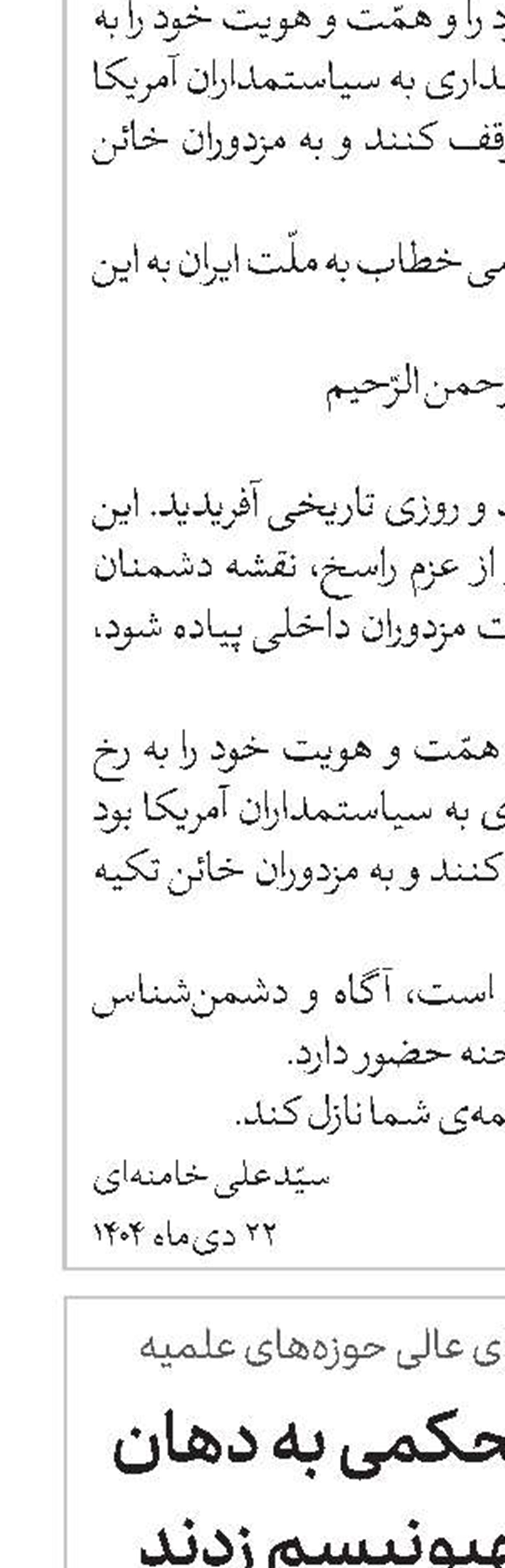 حضرت آیتالله خامنهای رهبر معظم انقلاب اسلامی شب پنجشنبه 6 آذر در سخنانی تلویزیونی خطاب به ملت عزیز ایران، با تأکید بر ضرورت تقویت و استمرار قدرتمندانه بسیج در نسلهای پیدرپی بهعنوان «یک ثروت بزرگ، حرکت همگانی و عامل افزایش قدرت ملی»، ناکامی آمریکا و رژیم صهیونیستی را در تحقق هیچ یک از اهداف حمله به ایران، نشانه شکست بدون تردید آنها خواندند و با بیان چند توصیه به ملت، همه مردم و جناحهای سیاسی را به حفظ و تقویت اتحاد ملی فراخواندند.