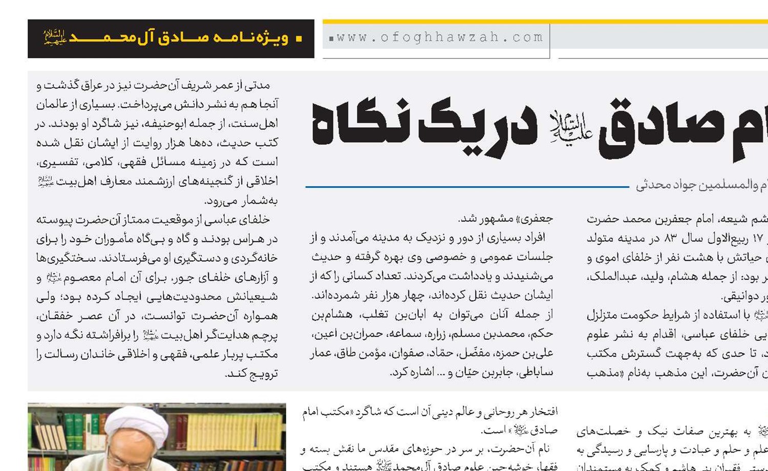 و ... حادثهای دیگرسالروز وفات جانگداز امام صادق(ع) یادآور حادثه غمبار دیگری است که هرگز از یادها نمیرود. حادثه هجوم وحشیانه عمّال رژیم طاغوت به مدرسه فیضیه و هتک حرمت این پایگاه عظیم شیعه و ضرب و شتم شاگردان مکتب امام صادق(ع) در سال 1342 ش.در آن روز، مظلومیت «عترت» و «روحانیت» پیوند خورد و عزادارانِ اشکریز در سوگ شهادت پیشوای مذهب(ع)، بر فاجعهای دیگر هم اشک ریختند و داغدار شدند.